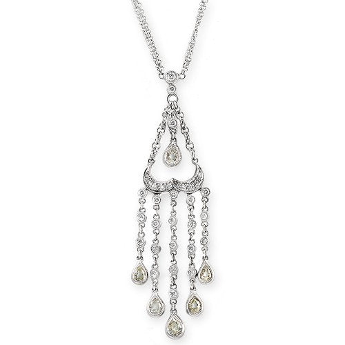 These 2.48 ct. t.w. Chandelier Diamond Necklace features Brilliant Pear-shaped and Round-cut Bezel Setting Diamonds accented with Round-cut Diamonds set in 18K White Gold. It comes with Double Chain, 16 inches Long with Lobster Claw Lock.