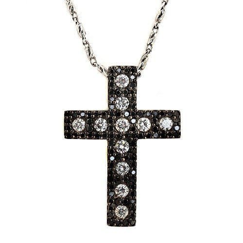 These 1.51 ct. t.w. Diamond Cross Necklace feature cascading Round-cut Black Diamonds accented with eleven Luminous Round-cut Diamonds set in 18K White Gold. It comes with 14K White Gold Italy Chain, 16 Inches Long with Lobster Claw Lock.