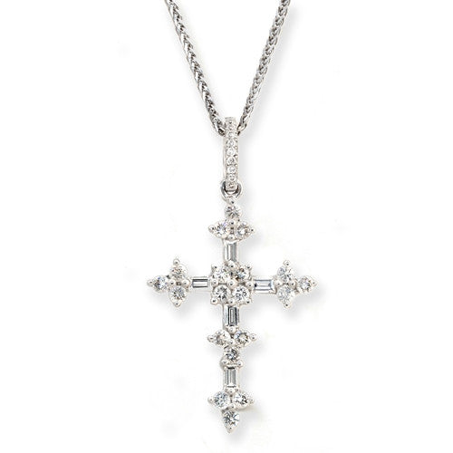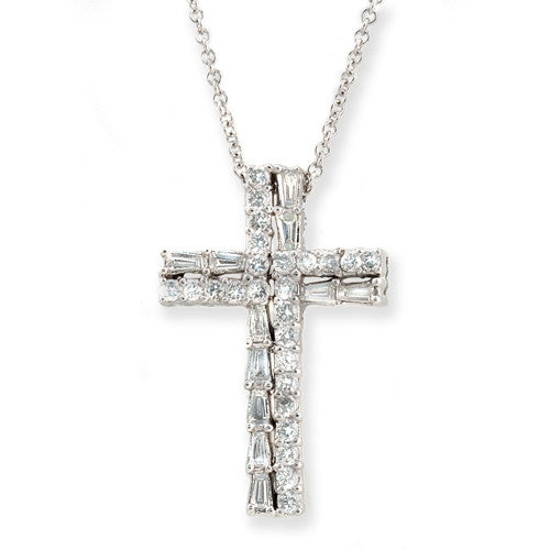 Beautiful Baguette and Round-cut Prong Diamond Cross Pendant, 18K White Gold.