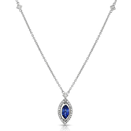 The stunning 18k white gold necklace lends it a luxurious feeling. A 0.86 ct marquise-cut Sapphire gemstone glitters beautifully by 0.35 ct. white diamonds glitters in the center of the floating halo pendant.