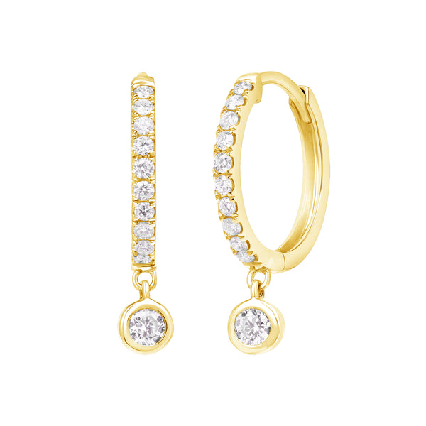 Round Diamond Bezel Drop Mini Huggie Hoop Earrings in 14k Yellow Gold