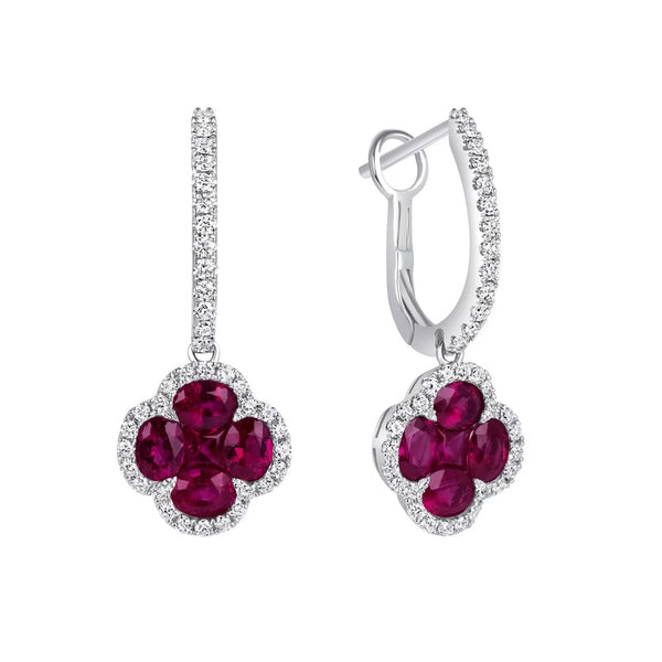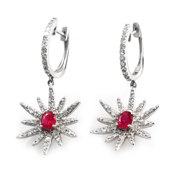 Ruby and Diamond Flower Cluster Dangling Earrings 14k White Gold