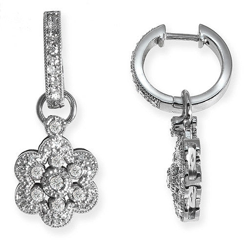 These Charming Floral Diamond Huggie Dangling Earrings in 14K White Gold feature a unique design weighs approximately 5.7 g and have an intricate flower design, Paved with Round-cut Luminous Diamonds and with Removable Dangles.