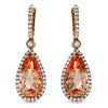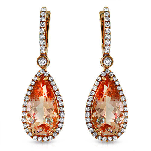 Fall in love with these Flawless Pear Shaped Morganite stone with incredible round diamonds on the side and lever backing. Complimented very well in 18k rose gold setting.