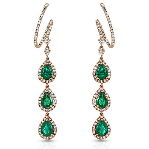 Captivating 3 piece pearl shaped emerald gemstone earrings surrounded by round cut diamonds on 18k rose gold.