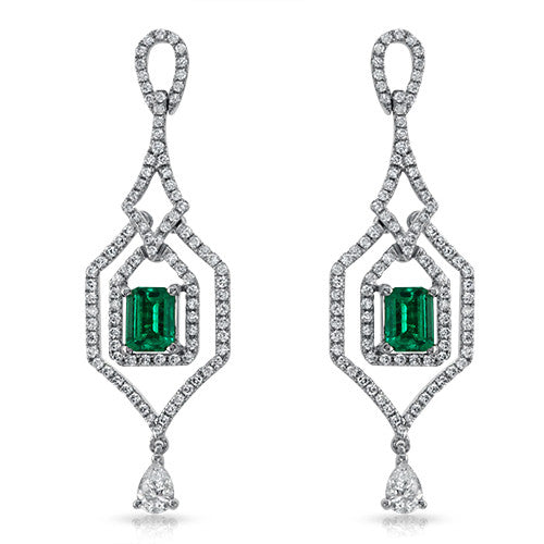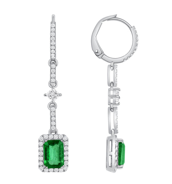 Diamond and Emerald Drop Earrings with Emerald-cut Emeralds in 18k White Gold