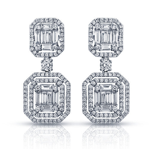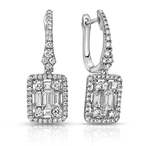 18 Karat White Gold 1.35 Carat Baguette and Round Diamond Dangle Earrings