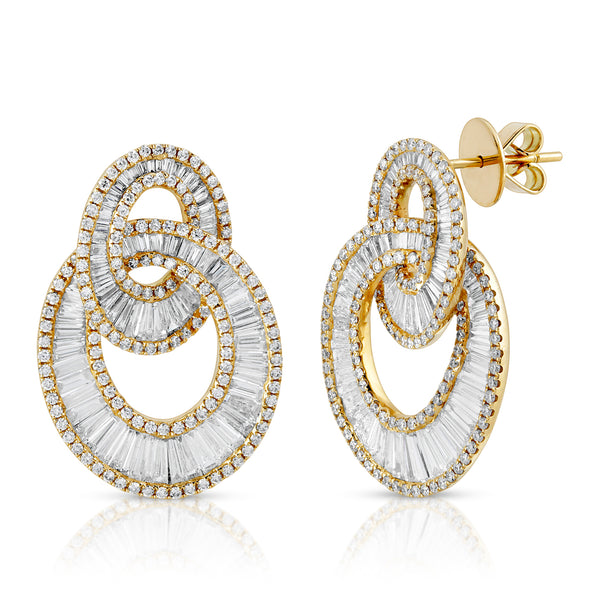 Open Circle Double Baguette & Round Cut 5.49 CT Diamond Earring in 18k Yellow Gold