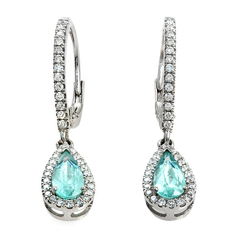 Don't step out into your magical evening of romance and glamour without the stunning sparkle of these Long Dangling Pear shape and Paraiba Tourmaline and Diamond Earrings. These fabulous pair feature an amazing 2.84 ct. t.w. of Paraiba and 0.40 Ct. of Diamonds, brimming with Radiance set in 14K White Gold. These unforgettable Paraiba earrings will keep you shining all night long!