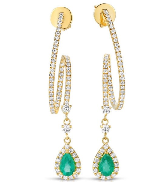Dangle Pear Shaped Emerald Gemstone Earrings with Round Cut Diamonds on a 14k Yellow Gold