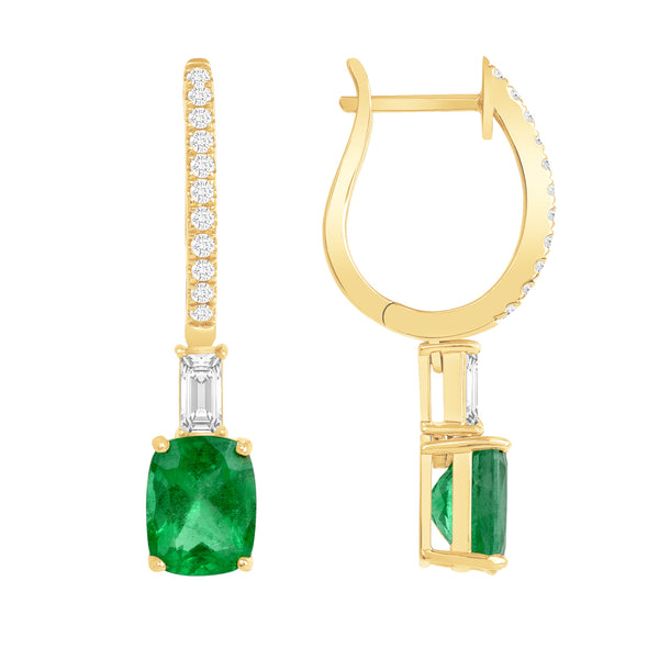 Dangling Earrings with Cushion-cut Emerald accented by Round cut Diamonds in 14k Yellow gold. These dazzling dangling earrings will surely be fitting nicely and comfortably on your ears. They are studded with precious round cut diamonds and Emerald gem stone. All set in 14k Yellow gold mounting.