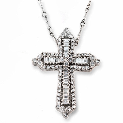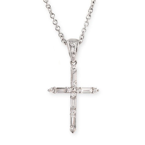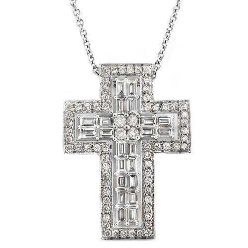 Round and Baguette Diamond Cross Pendant In 18k White Gold