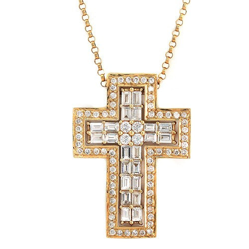Round & Baguette Diamond in a Double Cross Pendant Necklace, 18k Yellow Gold