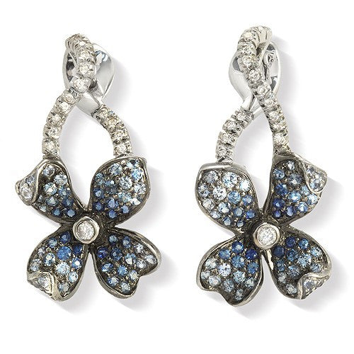 Spring has sprung with a swirly, sophisticated, sapphire flavor. Round-cut Swirl/Flower Paved with Round-cut Sapphire and Diamond Earrings, 18K White Gold.
