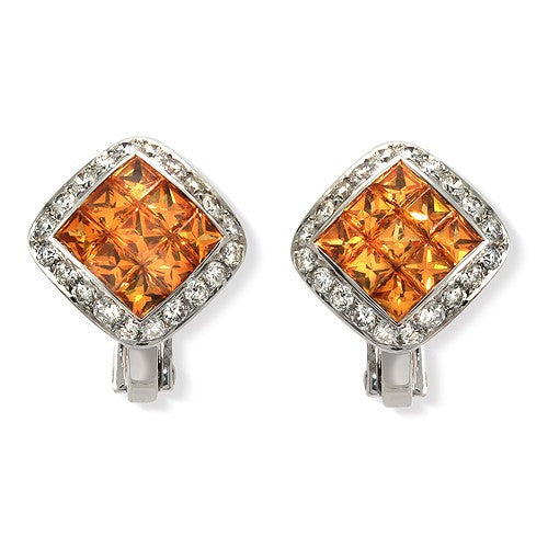 Add a simple touch of sapphire and lock eyes with a crowd in French-cut Invisible Setting Yellow Sapphire and Round-cut Pave Diamond Earrings, 18K White gold with Omega Lock/Clips.