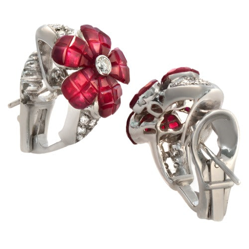 Spring has sprung with a floral masterpiece for the masses. Flower-shaped Earrings with French-cut Invisible Setting Ruby and Round-cut Pave Diamonds 18k White gold with Omega Lock.