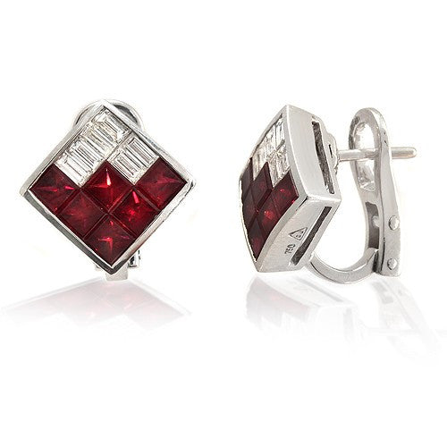 Stylish dazzling fancy Diamond-shaped Earrings that has a total carat weight of 3.30 ct. featuring Invisible Setting Princess-cut Ruby and Baguette Diamonds 18K White Gold with Omega Lock.