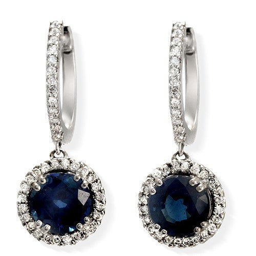 Steal the show with solitaire sapphire and diamonds. Round-cut Sapphire and Diamond Dangle&Huggie Earrings, 18K White Gold.