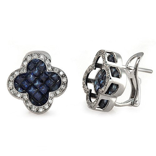 These 4.24 ct. Floral-style Diamond Earrings features french-cut invisible settings Blue Sapphire gemstones surrounded with Lustrous round-cut Diamonds mounted in 14K White Gold with Omega lock.