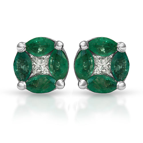 Gorgeous Princess-cut Center Surrounded with Four Marquise-cut Emerald, Stud Earrings, 18K White Gold with Post Lock.