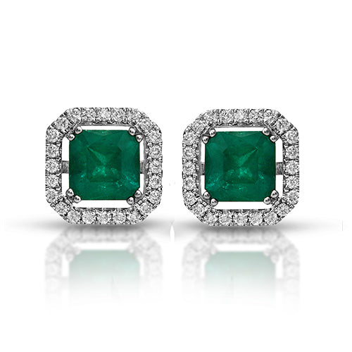 A deep and powerful Emerald gemstone will leave a lasting impression. These beautiful set of Emerald earrings is set on a 14k White gold halo setting with 0.15 ct. round diamonds. Border earrings.