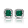 A modern pair of Colombian emerald & Halo diamond stud earrings. The center gemstones are AAA+ quality Colombian emeralds, handset in a 14K white gold. The earth mined emeralds have an exuberant green color that is recognized only in Colombian emeralds. These natural gems have excellent luster and outstanding clarity, fine quality stones. A generous diamond halo adds brilliance and beauty to the studs while highlighting the center incredibly. The classic duo of emerald and diamond studs is a timeless gift. Get this gorgeous pair today!