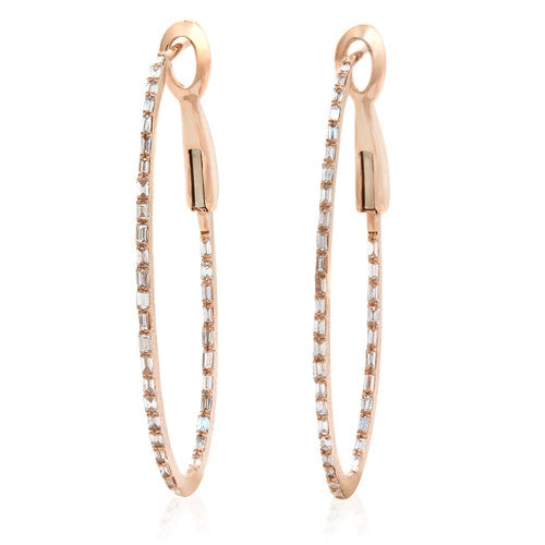 Trendy and chic. Eternity Diamond Hoop Earrings weighs 6.1 g, has a total carat weight of 0.86 ct and Paved with In and Out Baguette-cut Lustrous Diamonds. These Stylish earrings are framed in 18K Rose Gold.
