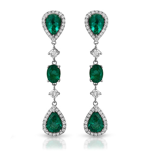 Miraculous Pear/Oval-Shaped Emerald and Round-cut Diamond Dangle Earrings, 18K White gold with Omega Lock.