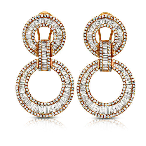 18k Rose Gold Double Circle Baguette Diamond Dangle Earrings