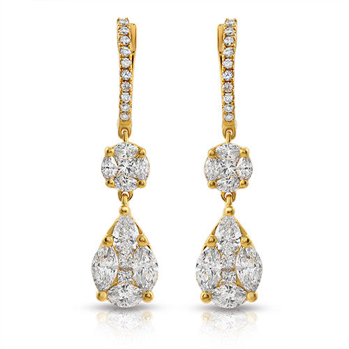 Don't step out into your magical evening of romance and glamour without the stunning sparkle of these Long Dangling Pear shape and Marquise Diamond Earrings. These fabulous pair feature an amazing 1.47 ct. t.w. of Diamonds, brimming with Radiance set in 18K Yellow Gold. These unforgettable Diamond earrings will keep you shining all night long!