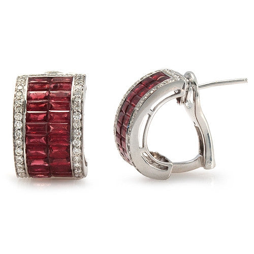 Stylish dazzling fancy Diamond-shaped Earrings that has a total carat weight of 3.30 ct. featuring Invisible Setting Princess-cut Ruby and Baguette Diamonds 18K White Gold with Omega Lock.