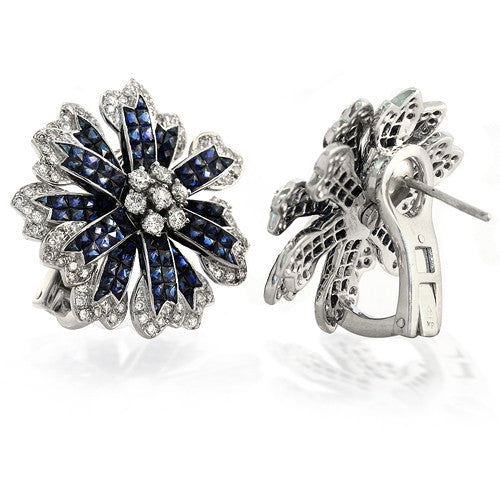 An out of this world floral piece. Cluster Flower, French-cut Invisible Setting Sapphire and Round-cut Diamond Earrings,18k White Gold with Omega Lock.