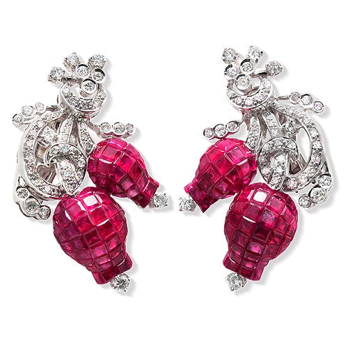 Spring has sprung with red hot rubies in this floral masterpiece. French-cut Invisible Setting Ruby and Round-cut Diamond Flower Earrings, 18k White gold with Post Lock.