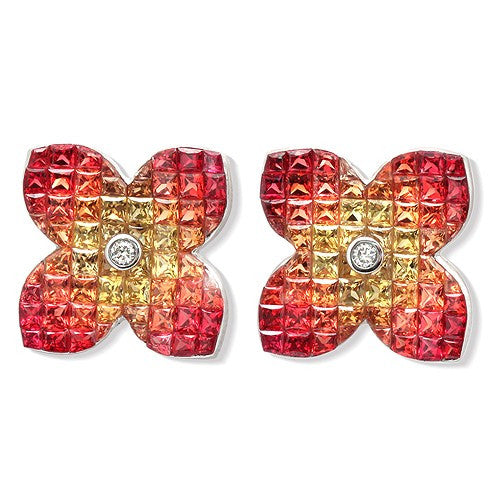 Spring has sprung with bold, orange flowers. Earrings with French-cut Invisible Setting Orange and Yellow Sapphires and Round-cut Diamonds, 18K White Gold with Omega Lock.