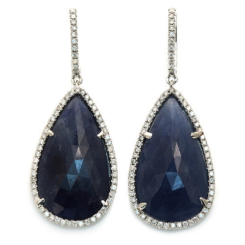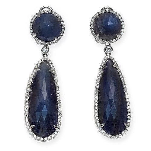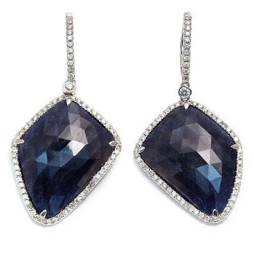 These 39.69 ct. t.w. Beautiful pair of Fancy-cut Sliced Blue Sapphire drop dangle earrings is surrounded with lustrous White round-cut Diamonds framed in 14K White Gold with Omega Lock. A stunning piece that will completes any outfit.