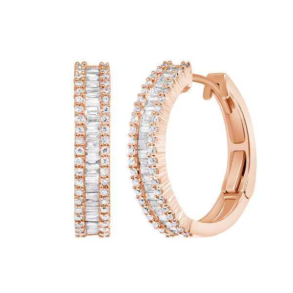 Magnificent Baguette Channel and Round-cut Pave Diamond Hoop Huggie Earrings, 18K Rose Gold.