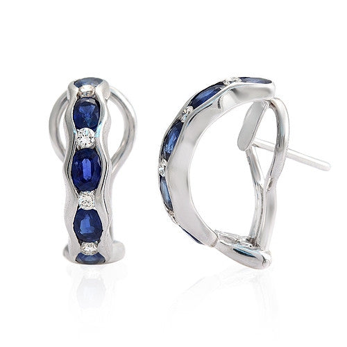 18k White Gold Oval Blue Sapphire Diamond Huggie Earrings