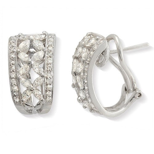 A stunningly royal piece for the modern collector. These 2.14 ct. t.w. Diamond Huggie earrings features Brilliant Marquise Diamonds Floral style and Round-cut Diamond Earrings set in 18K White Gold with Clip and Omega Lock.