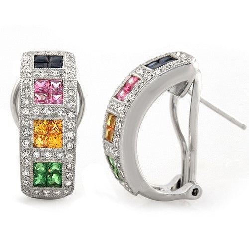 18k White Gold Fancy Multicolor Sapphire Diamond Huggie Earrings