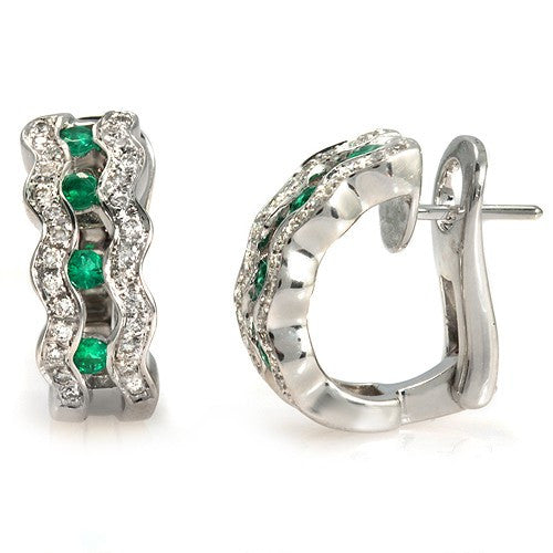 Stylish and modern. These pair of Lustrous Diamond Huggie Earrings has a total carat weight of 1.28 ct. featuring four Round-cut Emerald gemstones surrounded with cascading round-cut Diamonds that has a waved-style that makes it so unique. crafted in 18K White Gold with Omega Lock.