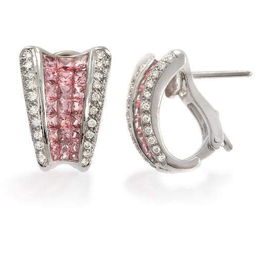 Stunning and Gorgeous. These Lovely pair of Lustrous Diamond Huggie earrings has a total carat weight of 2.66 ct. featuring French-cut Invisible Setting Pink Sapphire gemstones surrounded with dazzling Round-cut Pave Diamonds, set in 18K White Gold with Omega Lock.