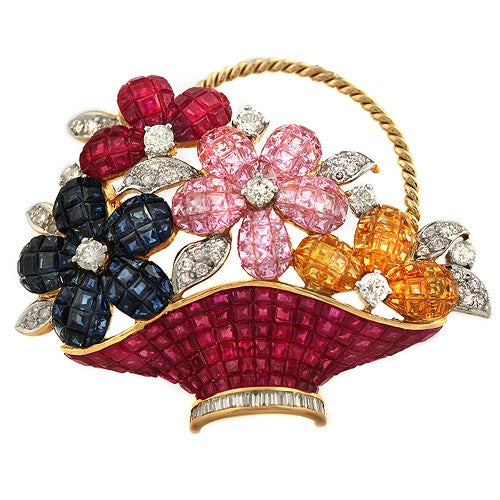 Spring is here! Check out this Multicolor Sapphire and Ruby Broach, Paved with Princess-cut Invisible Setting Rubies, Blue/Yellow/Pink Sapphires, Baguette Channel Setting Diamonds and Round-cut Prong Diamonds; 18K Yellow Gold.