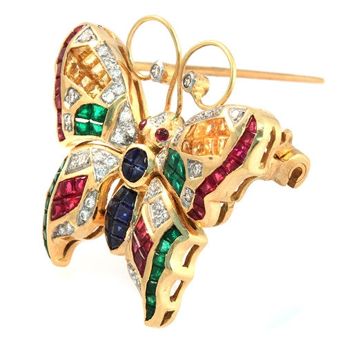 Multicolor Gems & Diamond Butterfly Broach, 18k