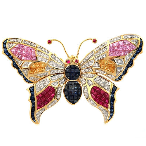 Spring has sprung! Princess-cut Blue/Yellow/Pink Sapphire and Ruby, with Round Cabochon Ruby Eyes Butterfly Broach, Paved with Round-cut Diamonds, 18K Yellow Gold.