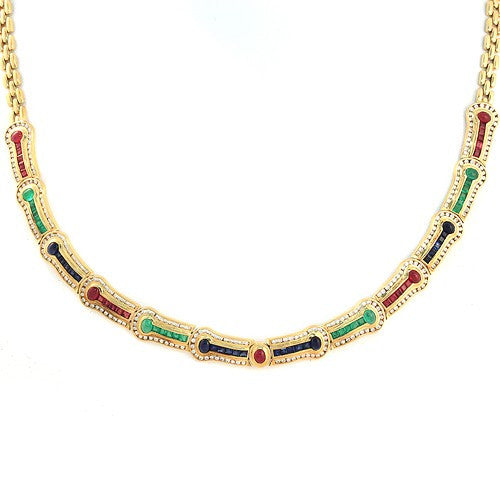 Majestic Cabochon and Square-shaped Ruby, Sapphire and Emerald, paved with Diamonds Necklace, 14K Yellow Gold. The Length of the Necklace is 16 inches with Box Clasp Lock.