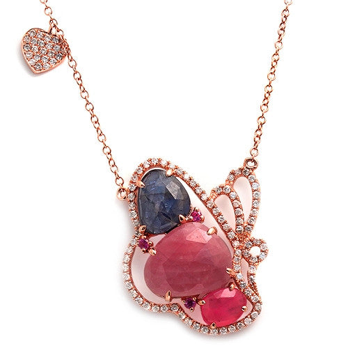 Fancy-cut Multicolor Slice Semiprecious Stones, paved with Round-cut Diamonds Butterfly Pendant Necklace, 14K Rose Gold with Lobster Claw Lock.