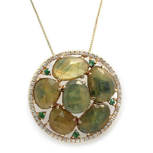 Fancy-shaped Sliced Green Sapphire and Round-cut Tsavorite, Paved with Round-cut Diamonds, Pendant Necklace, 14K Yellow Gold with Spring Ring Lock.