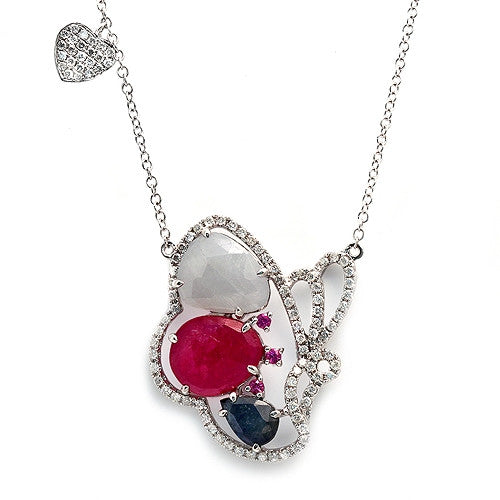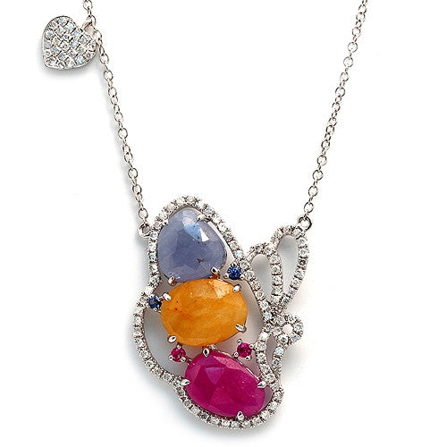 Fancy-cut Sliced Multicolor Gemstone Butterfly Pendant, and Heart-shaped Charm, Paved with Round-cut Diamonds, Necklace, 14K White Gold with Lobster Claw Lock.