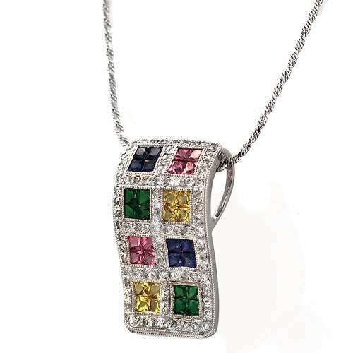 Multicolor Gems and Diamond Pendant Necklace In 18k White Gold