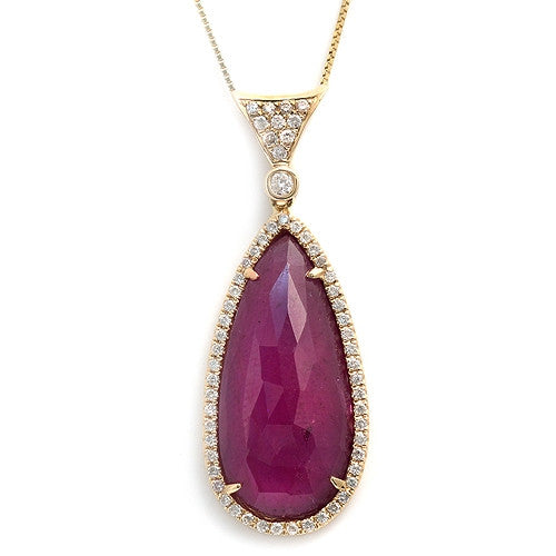 Teardrop Shape Pink Slice Ruby Pendant Necklace, 14k Yellow Gold